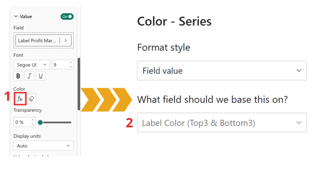 To color Top 3 and Bottom 3 data labels in Power BI, simply create a DAX measure that returns a color based on ranking, then apply it using conditional formatting in Data labels → Color (fx) → Field value.